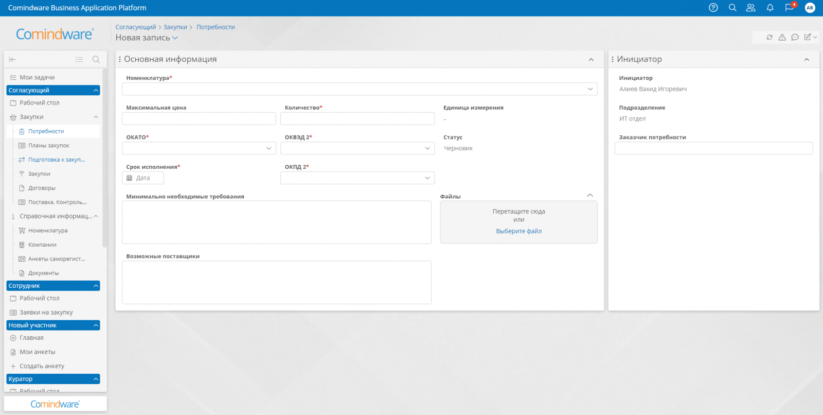 Для сбора потребностей используют специальные заявки. Так заявка выглядит в Comindware Управление закупками.