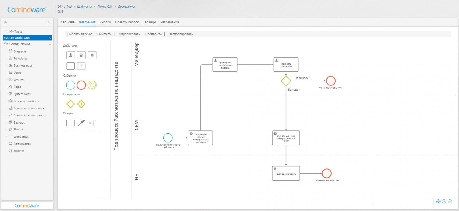 Пример модели подпроцесса «Рассмотрение инцидента» в сценарии, когда клиент после звонка в службу поддержки выставляет низкий рейтинг в мобильном приложении