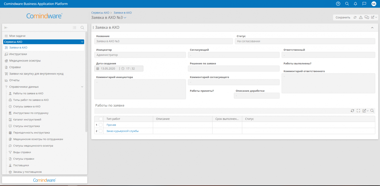 На Comindware Business Application Platform можно создать решение для управления АХО, чтобы автоматизировать административные и финансовые бизнес-процессы, включая управление любыми типами согласований, хозяйственными операциями, оборотными активами предприятия, производственными и ИТ-активами предприятия.
