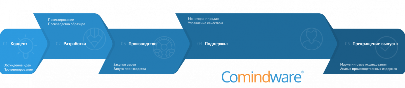 На базовом уровне управление жизненным циклом продукта (product lifecycle management) — это стратегический процесс, который разбит на 5 основных этапов: от зарождении идеи продукта до его разработки, производства, поддержки и прекращения выпуска. Как еще принято говорить, это путь продукта «от колыбели до могилы».
