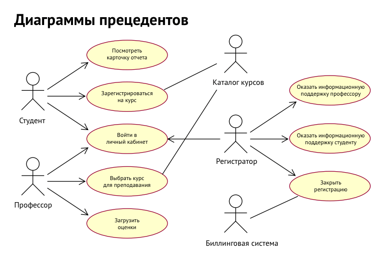 Показывают набор действий, доступных отдельному пользователю при работе в системе. Прецедент в данном случае — это стандартный вариант использования функциональных возможностей. Его принято обозначать эллипсом с подписью в форме глагола. Например, ввести логин и пароль, заполнить заявку на закупку, внести данные клиента или согласовать проект договора.