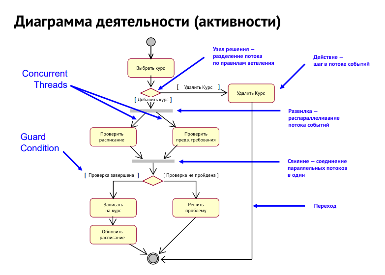 Для чего используют диаграмму действий? Чтобы понять, какие действия приводят к нужному результату. Ведь систему проектируют для достижения целей, а не просто так.