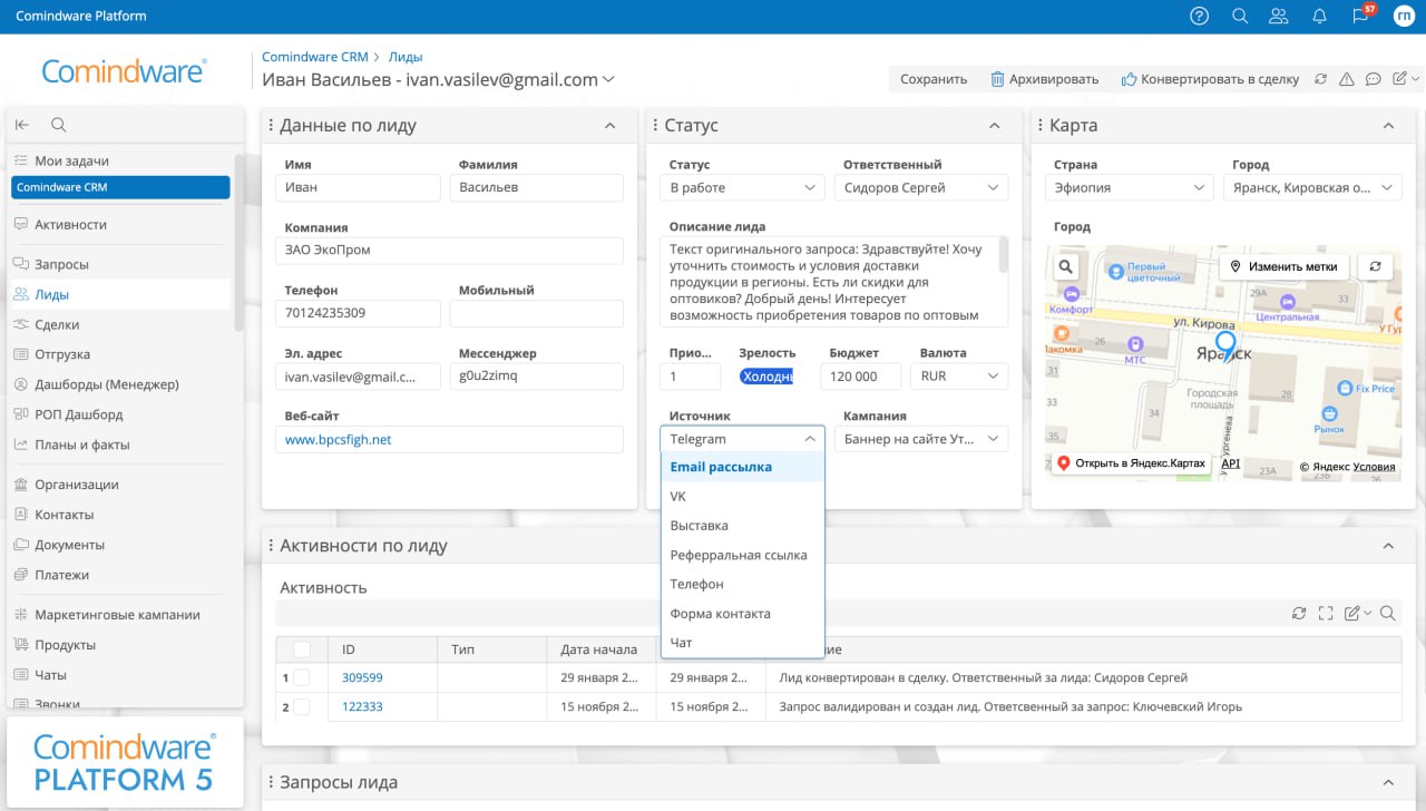 Работа с продажами, особенно в B2B-сегменте, ориентирована не столько на разовые сделки, сколько на непрерывный цикл взаимовыгодных отношений с клиентами. Comindware CRM — не просто цифровой журнал для учета контактов, а гибкая система, которая позволяет выстроить сквозную работу от обработки входящих до закрытия сделки, контроля дебиторской задолженности и анализа эффективности. Продукт адаптируется под уникальные процессы продаж компании, учитывая этапы воронок и логику работы по разным видам сделок.