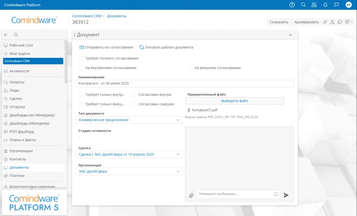 Формирование коммерческих предложений (КП) зачастую остается операционной задачей, требующей ручных усилий. Comindware CRM подходит к этому вопросу системно, предоставляя инструменты для автоматизации всего жизненного цикла КП. Работа с коммерческими предложениями в системе строится на базе гибко настраиваемых шаблонов — система позволяет компаниям гибко настраивать такие шаблоны документов, которые необходимы, а нужные для предложений данные — реквизиты клиента, актуальные позиции номенклатуры, утвержденные цены и скидки — будут подставлены автоматически. Это не только ускоряет подготовку — например, рекламная платформа SlickJump сократила ручные операции на 70%, — но и обеспечивает стандартизацию. Менеджеру необходимо лишь проверить готовый документ и отправить его потенциальному клиенту.
